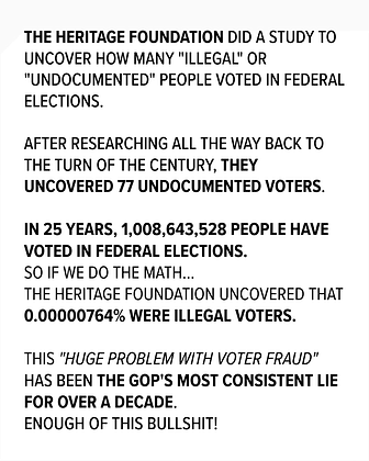 The actual architects of the current American authoritarian regime, The Heritage Foundation (you know, those “Project 2025” folks), commissioned data that ended up DISPUTING their claims of a “huge problem with voter fraud”.