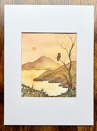 When one of your favorite Substack watercolorists @K.L.Rockwell takes a minute to send her art across the country as a thank you. I'm in love with this owl enjoying a sunset and can’t wait to frame and hang it. Life really is the little things.