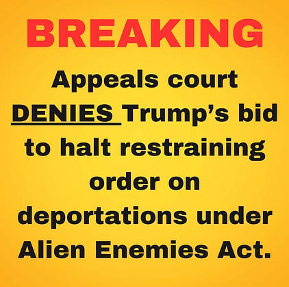 BREAKING: Appeals court DENIES Trump’s bid to halt restraining order implemented by Judge Boasberg on deportations under Alien Enemies Act.