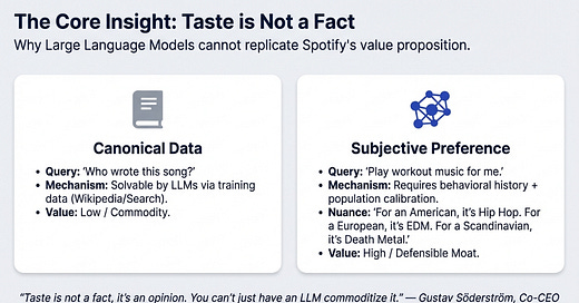 Spotify’s advantage isn’t access to music. It’s mapping language to individual taste at global scale — a dataset that gets stronger with AI, not weaker.