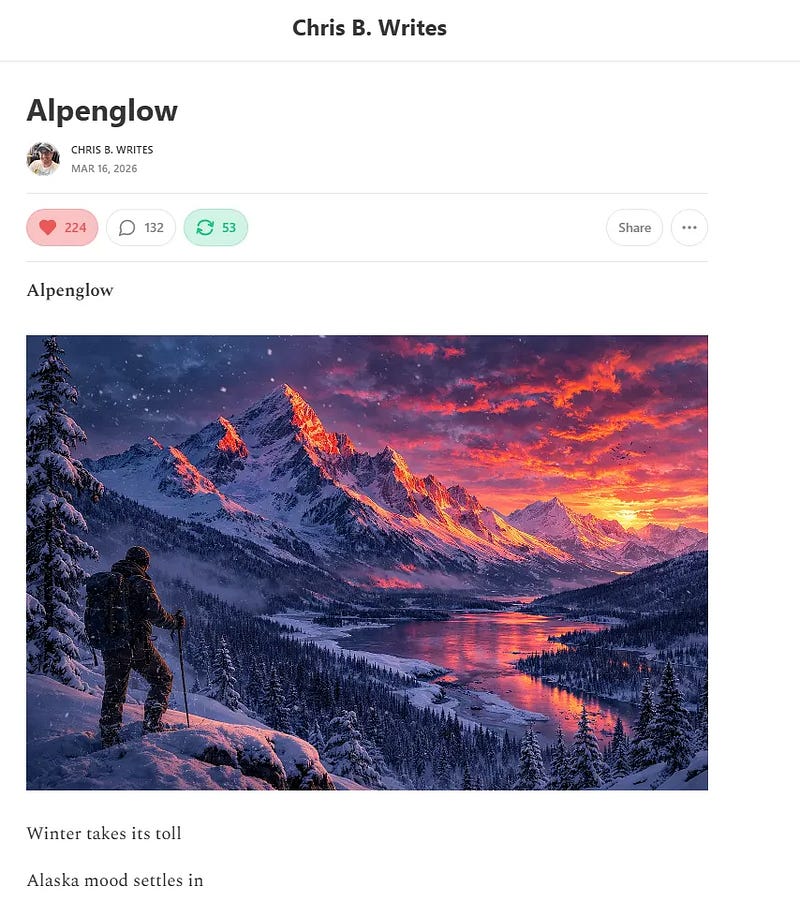 In German that’s Alpenglühen. Since I’m a huge fan of the Alps, snow and the glow that gives so much hope, this poem evoked so many feelings in me and I had to bring Chris and his son Bray Bray to you