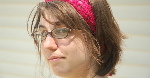 This is a blast from my past - I think I was about 25 in this photo. How glasses styles have changed. I still love this little headwrap though. A quick crochet pattern to use up all kinds of scraps. Available for paid subscribers in the Craft Leftovers Pattern archive.