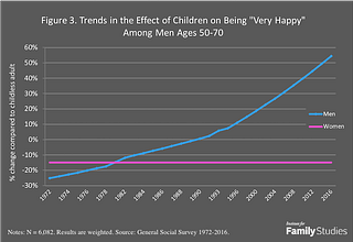 Take a look at the chart below. That’s a study from an extremely traditional, conservative, pro-family institute, and it shows that men have become INCREDIBLY MORE HAPPY, once they’ve lived their life, as fathers, since the 70s. Having kids and being a family man used to make men goddamn miserable. They were not allowed to have emotions, they barely interacted with their kids, they carried 100% of the stress and burden of supporting the family, and most of them came home from work, screamed and yelled, and that sit in a chair drinking and being pissed off til they had to go do it again the next day. Their personal happiness and satisfaction has skyrocketed since the social changes that started in the 70s. That’s why old men over 70 are a pretty happy bunch, and not on this neo-masculinity train — they remember how men used to be in the good old days, which was almost universally miserable bastards.