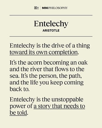This is not a precise definition, but it is an essential piece of philosophical vocabulary. Joe Sacks, informed by Heidegger, translated entelechy from Aristotle’s writings as a being-at-work-being-itself. It is one of Leibniz’s definitions of a monad, and it was coined by Aristotle to describe living organisms possessing the means of metabolism and reproduction.