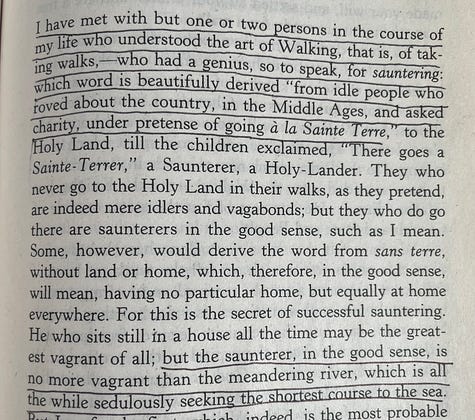 Thoreau is the master of sauntering, but philosophy and walking have long been entwined. Consider Aristotle’s peripatetic school or Rousseau and Nietzsche in the Alps. Kant walked too, albeit in a tamer setting. Of course, Proust’s account of Combray would be unthinkable without the walks along the Guermantes Way in his philosophical novel.