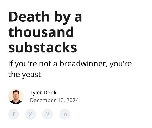 Today the founder of beehiiv wrote a pointed Substack takedown post. It was called “Death by a thousand substacks: if you’re not a breadwinner, you’re the yeast”.