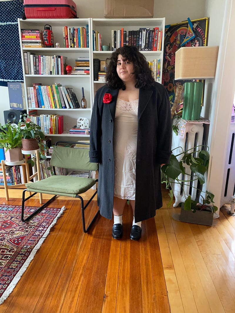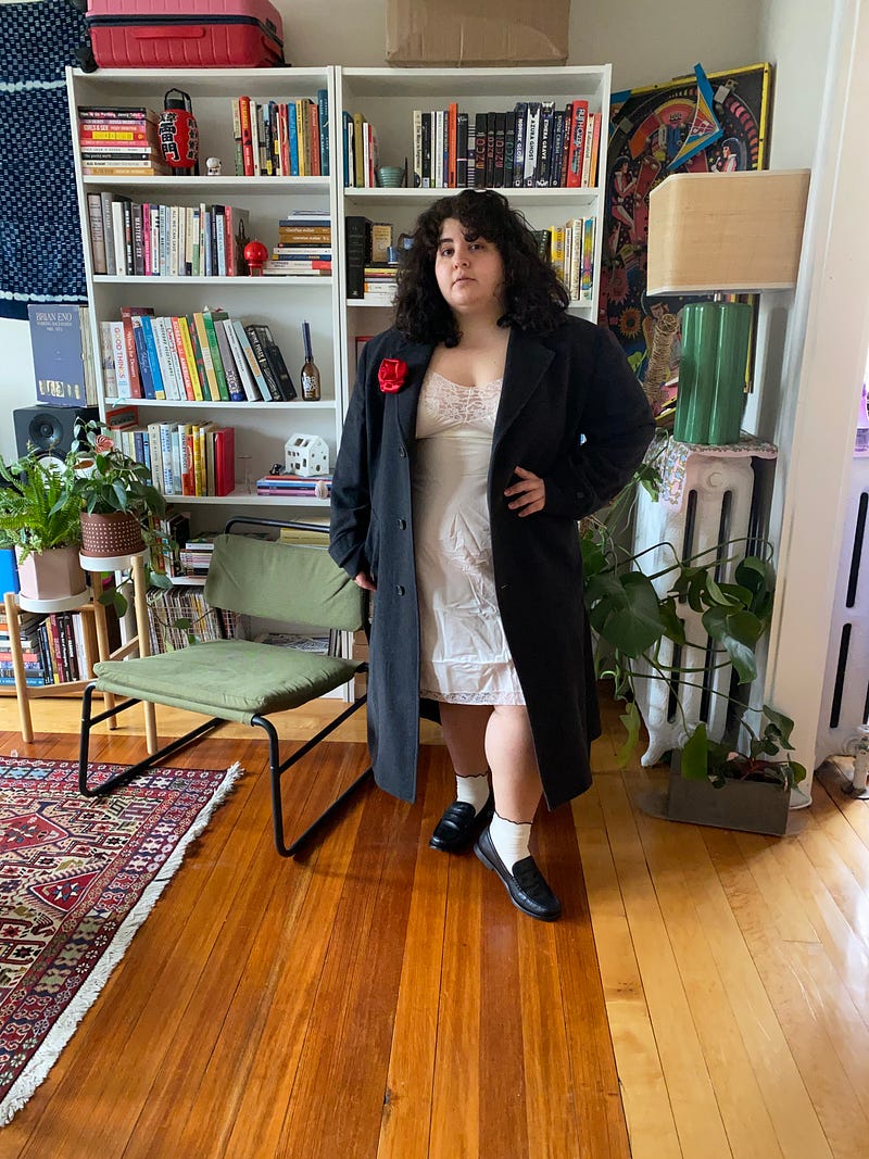 Photo of Alexa Chung by Sean Thomas. My coat + slip dress found irl thrifting in Boston. My rose clip is from Room Shop Vintage. Loafers are Cole Haan but I wish I’d thrifted them cuz they’re too stiff.
