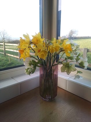 I am in thrall to this glorious Spring day and the abundance of bright, dancing flowers appearing in the farmhouse garden. Had to bring some indoors too.