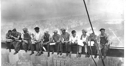 There is a legendary photograph of 11 men sitting on a beam having lunch. They are 800 feet above the ground below. No safety harness, no net. Just a sandwich. Makes you wonder what the impact of a pickle is when dropped from 800 feet?