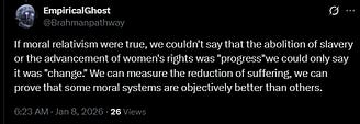 If moral relativism were true, we couldn't say that the abolition of slavery or the advancement of women's rights was "progress"we could only say it was "change." We can measure the reduction of suffering, we can prove that some moral systems are objectively better than others.