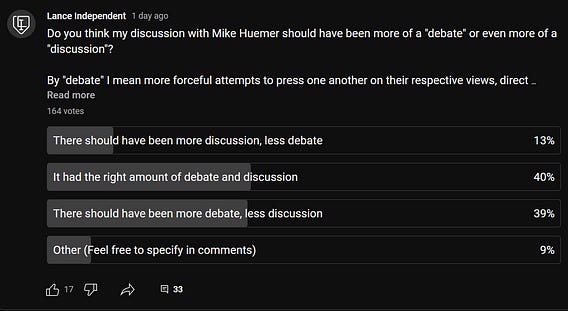 The discussion I had with Mike Huemer attracted a lot of interest. There are ~4k+ views on the relatively small channel where it appeared and over 250+ comments. I ran a poll over on YouTube asking people if they’d have liked more debate, since much of it became more of an open discussion. It looks like most people were happy with where it was at or favored more debate, as the two are basically tied:
