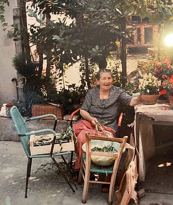 I was taking a walk around my favorite village close to home and entered the local Alimentari, a lovely place frozen in time that still looks like it did in the ‘70s. The owner struck up conversation and we started chatting. I noticed this picture hanging and she told me that that was her husband’s grandmother, who opened the Alimentari way back when. I love these pictures because many of us have a similar picture of our grandmas: those specific clothes, trimming veggies on that specific white basin, on those specific threaded plastic chairs that came in several colors. It’s nostalgia, but it’s also the reminder of the good things we had in spite of all our problems: warm sun, evenings chatting in company that smelled of blooming four-o’-clocks, fresh produce, a sense of community, tight-knit family.