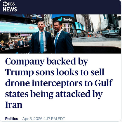 Trump’s kids’ try to sell their drones to the countries being attacked because of Trump’s wars