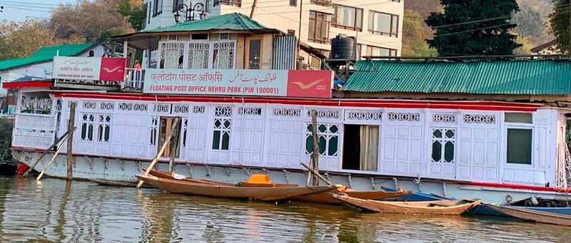 On Dal Lake in Srinagar, the city’s floating post office sits in a traditional Kashmiri houseboat, gently moored near the lakeshore. You step onto the wobbling gangplank, surrounded by clusters of ornate flat-bottomed shikaras, and suddenly the act of mailing becomes a small adventure.