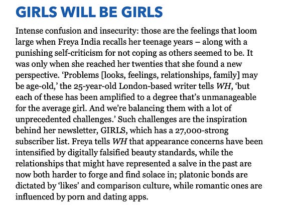 So glad to be able to include Freya India’s voice and her GIRLS newsletter in a piece I recently wrote for Women’s Health magazine on what’s impacting the mental health of teenage girls right now. Love the important conversations she and others are having on Substack on the topics affecting young women ✨