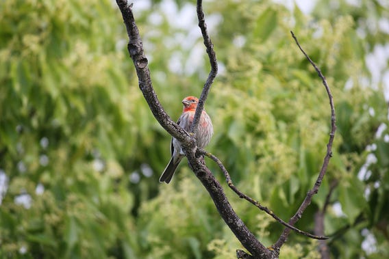 In my home studio, my environment is much different. For most of the year, I work with the windows open to welcome my favorite "writing soundtrack"—birdsong. The surrounding trees serve as a lively stage for a variety of neighbors, including mourning doves, red-winged blackbirds, cedar waxwings, and song sparrows. But the true stars of my writing sessions are the lesser goldfinches and house finches like the one pictured here.