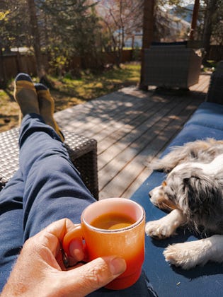 No phone. No book. No podcast. No computer. No paper. No instagram. No X. No substack. No music. No one. Just me & Acre, a coffee (and a camera), listening to the birds, sitting in the sunshine. This is part of every day lately and in many ways the best part.