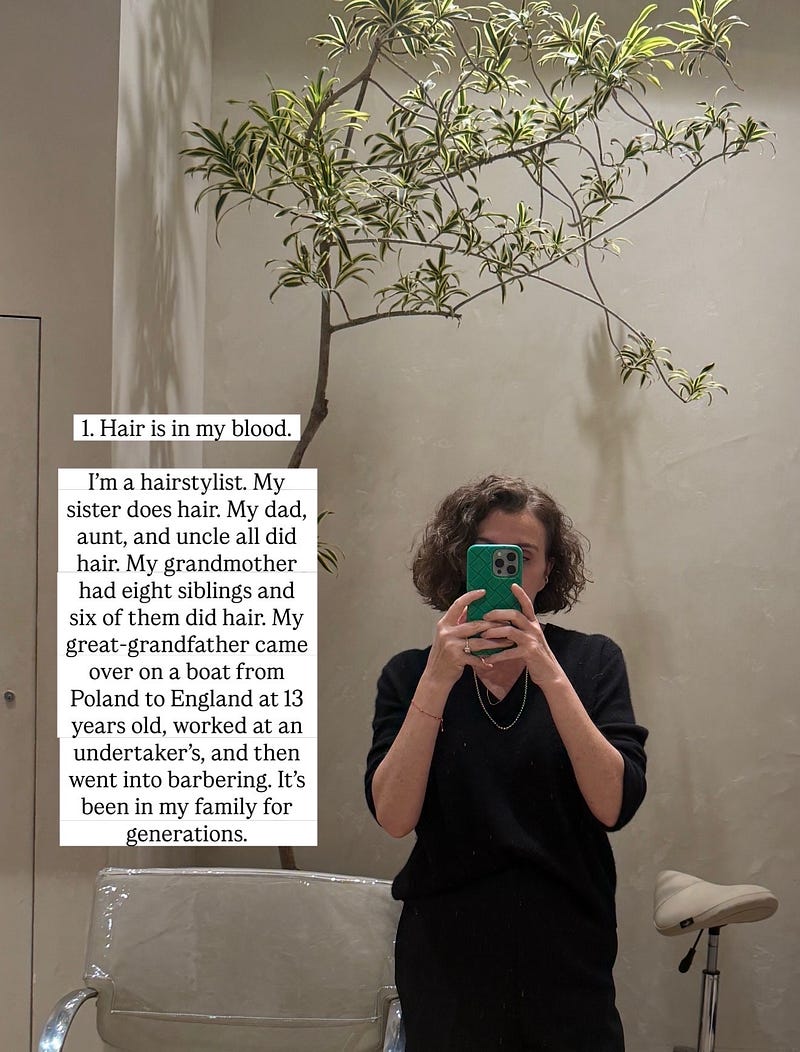 I'm a hairstylist. My sister does hair. My dad, aunt, and uncle all did hair. My grandmother had eight siblings and six of them did hair. My great-grandfather came over on a boat from Poland to England at 13 years old, worked at an undertaker's, and then went into barbering. It's been in my family for generations.