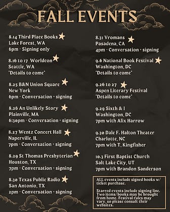 Starred events will have signing lines where you can get any two books/items signed. (Please make sure to look at the individual sites for the stores/conventions as signing rules vary slightly from place to place.)