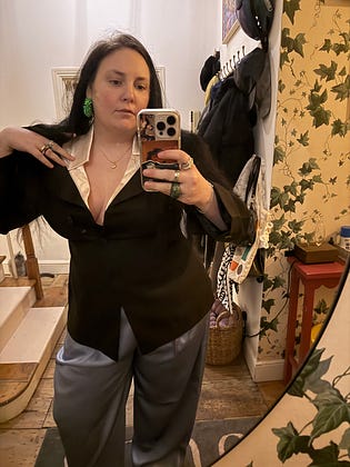 Was really feeling myself, like I’d located a life hack via this (very on sale) Stine Goya blazer with a built in shirt illusion. Instant outfit! No tank or even bra needed! Until I got hot at a work dinner and started to mindlessly unbutton it and my husband was like “uh…”