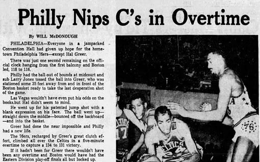 Just made a huge sports history discovery. 60 years ago yesterday the Philadelphia 76ers were down 2 games to 1 to the Boston Celtics and were losing game 4 in Philly 118 - 116 with 1 second remaining. A loss would mean almost certain extinction in the playoffs. The 76ers had the ball and one last attempt to tie the game. They got the ball into Hal Greer 35 feet from the basket. He took the shot and made it and sent the game to OT. Philly won in OT and tied the series at 2 games apiece.