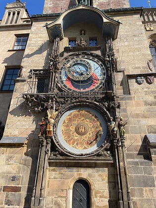 The Astronomical Clock on Prague’s Old Town Square: stunning and intricate mechanism displaying old Bohemian time, solar time, sidereal time, zodiac, season, relative positions of sun, moon and earth. Mind blowing. Wonder why Gregor Sansa was obsessed by not being late when he turned into a bug? And why was FK always late to all his appointments?…