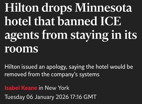 I was excited to see a hotel (affiliated with Hilton) do the decent, peaceful, within-their-rights thing as resistance to this administration and likely as protection for staff that may be at risk of being profiled by ICE agents staying at the hotel.