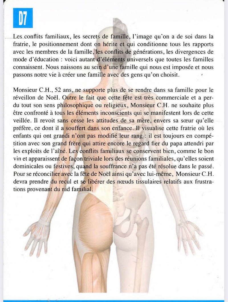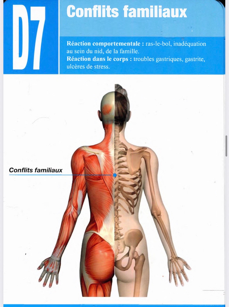 Dans l’approche somato-émotionnelle utilisée par Roger Fiammeti pour décoder le langage émotionnel du corps, les conflits familiaux se logent dans la D7 du corps.