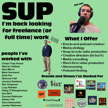 I am wrapping up my work with Chapo Trap House soon...which means I'm back to looking for more work 😎😎. Here's what I do at a glance… dm me or shoot me an email at harryjkrinsky@gmail.com. You can find my full portfolio here: