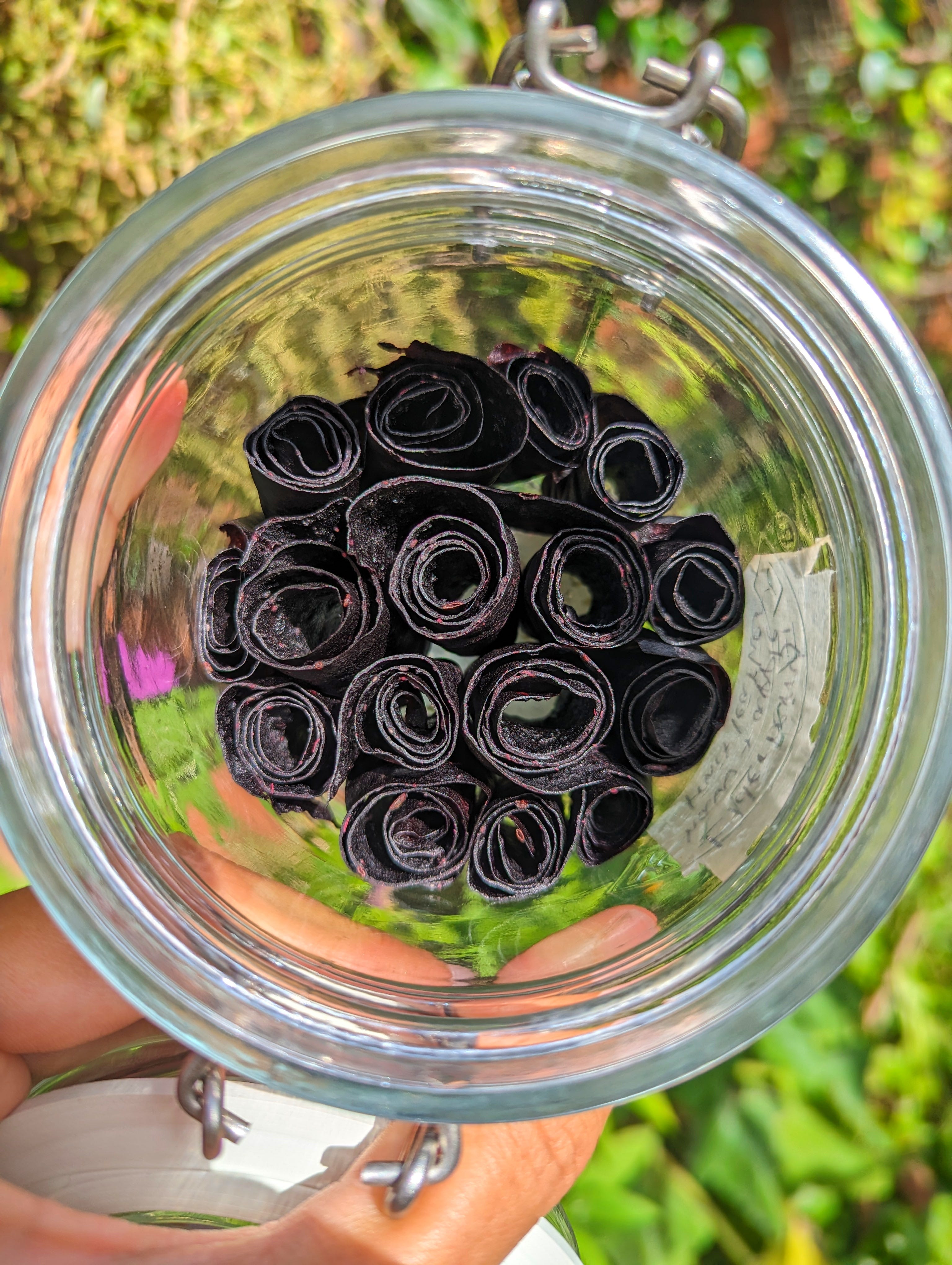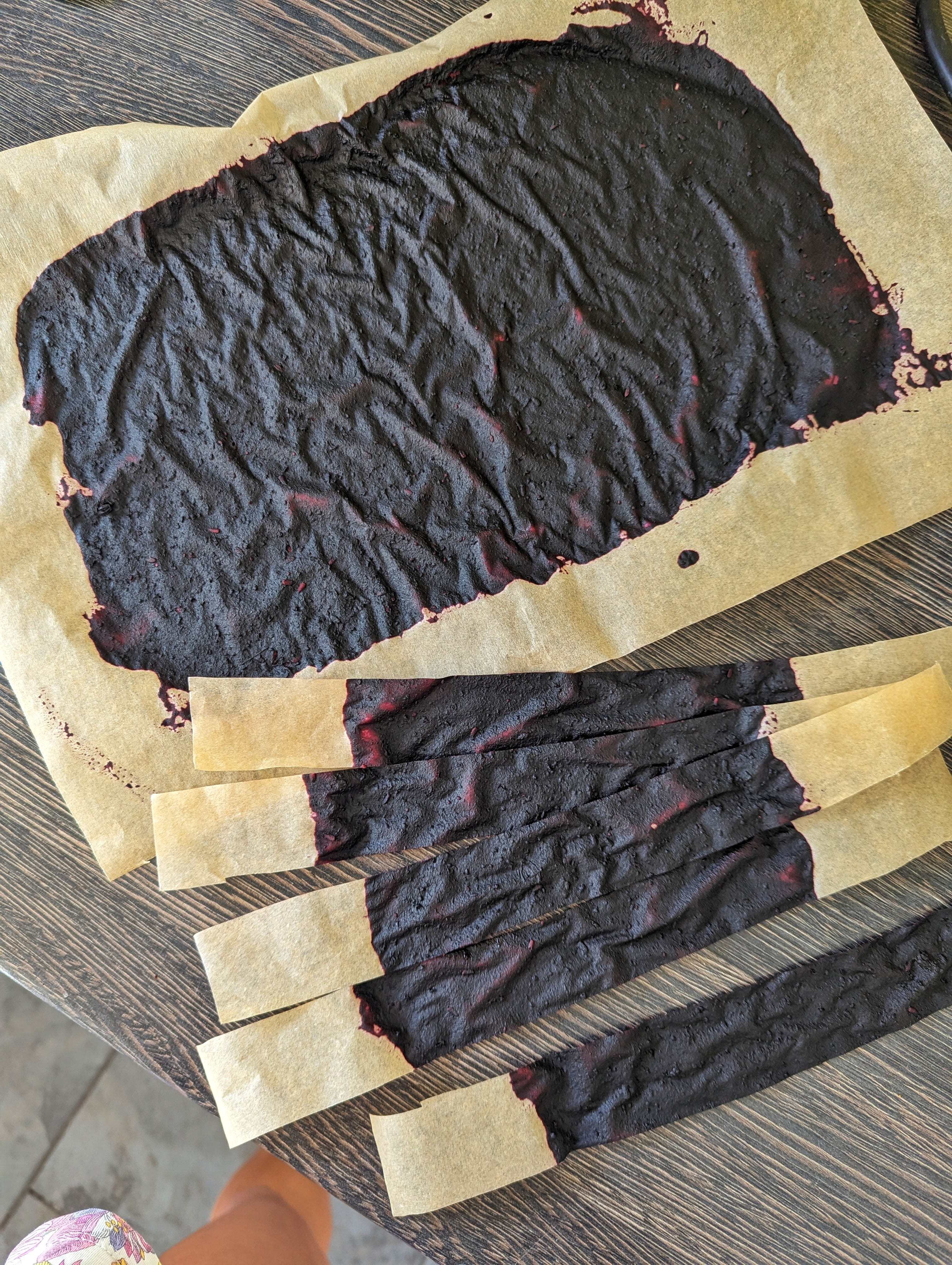 I've done a fun food thing, made some fruit leather. The perfect way to preserve all the fruity abundance at this time of year. You can make it with any fruits / berries. Chuck in a pan, cook down to mush, pass through a sieve, reduce, spread on non-stick paper, dehydrate, cut into strips, peel off the leather, roll them up, store in a jar. I added a fermentation step before drying by just leaving it out for two days. Fruits here: spent elderberries (from winemaking), haws, a disappointing peach, grapes and bloobs from the freezer, rum soaked pomegranate seeds. Sour, fruity, lacto-fermented snackage. Taste like Haribo sours, but boozier.