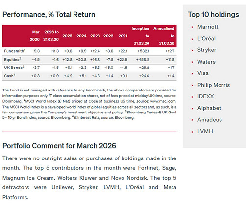 Fundsmith lost -9.3% (in £) in Mar-26, twice the loss of MSCI World's -4.5%