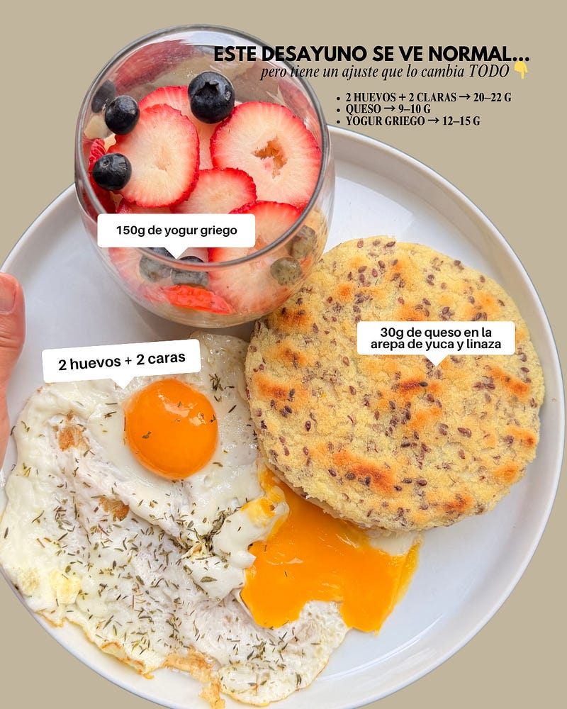 (bowls, torticas, desayuno con arepa de yuca y semillas… todo real).