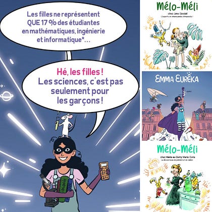 Du coup, en littérature jeunesse, on peut jouer un rôle là-dedans (même petit) - attention, mode promo activé - en abordant des figures réelles des sciences (coucou Jane Goodall et Marie Curie dans Mélo-Méli), ou en imaginant des super-héroïnes scientifiques du quotidien, comme Emma Eurêka :-)