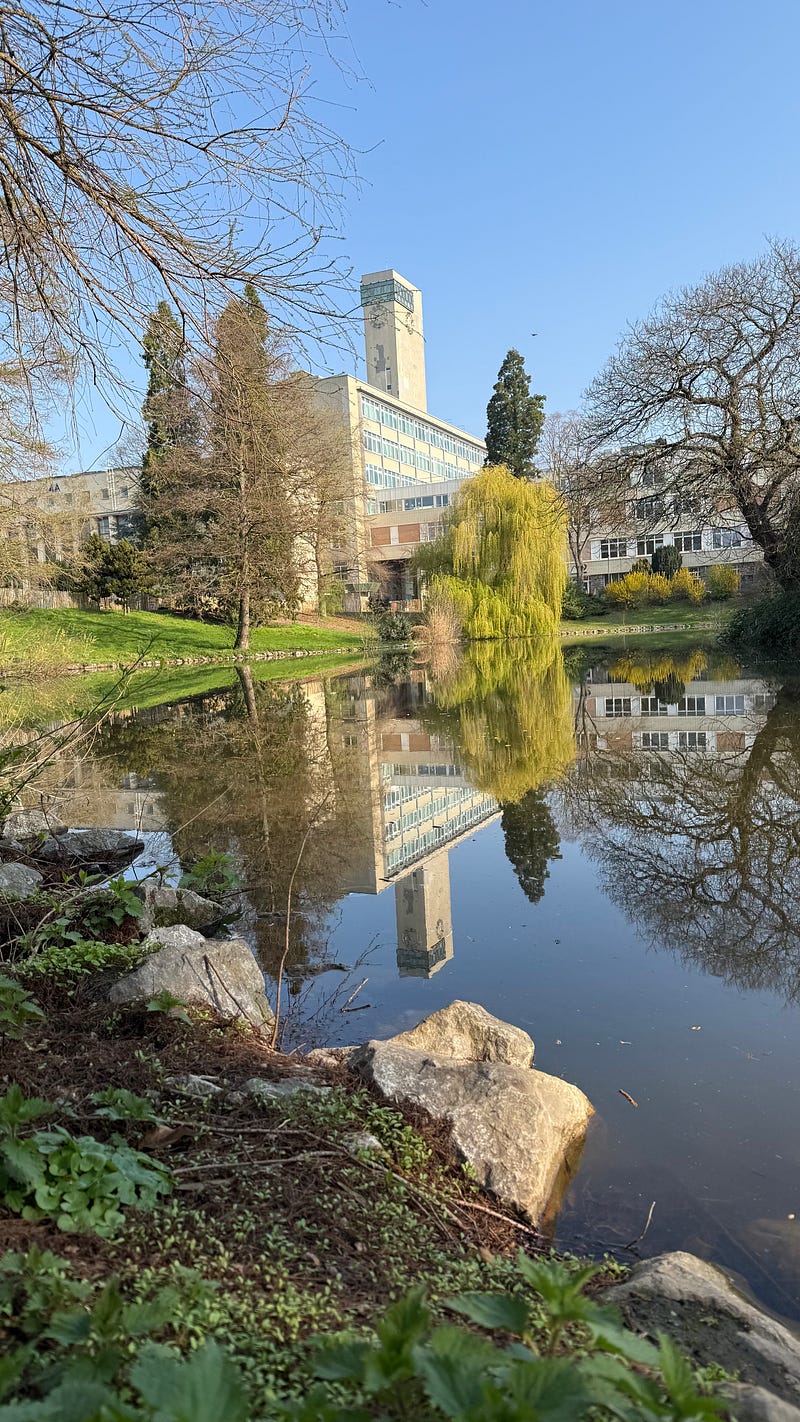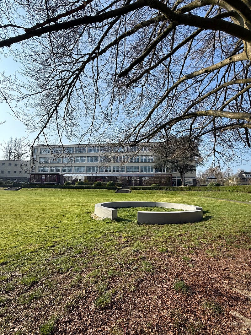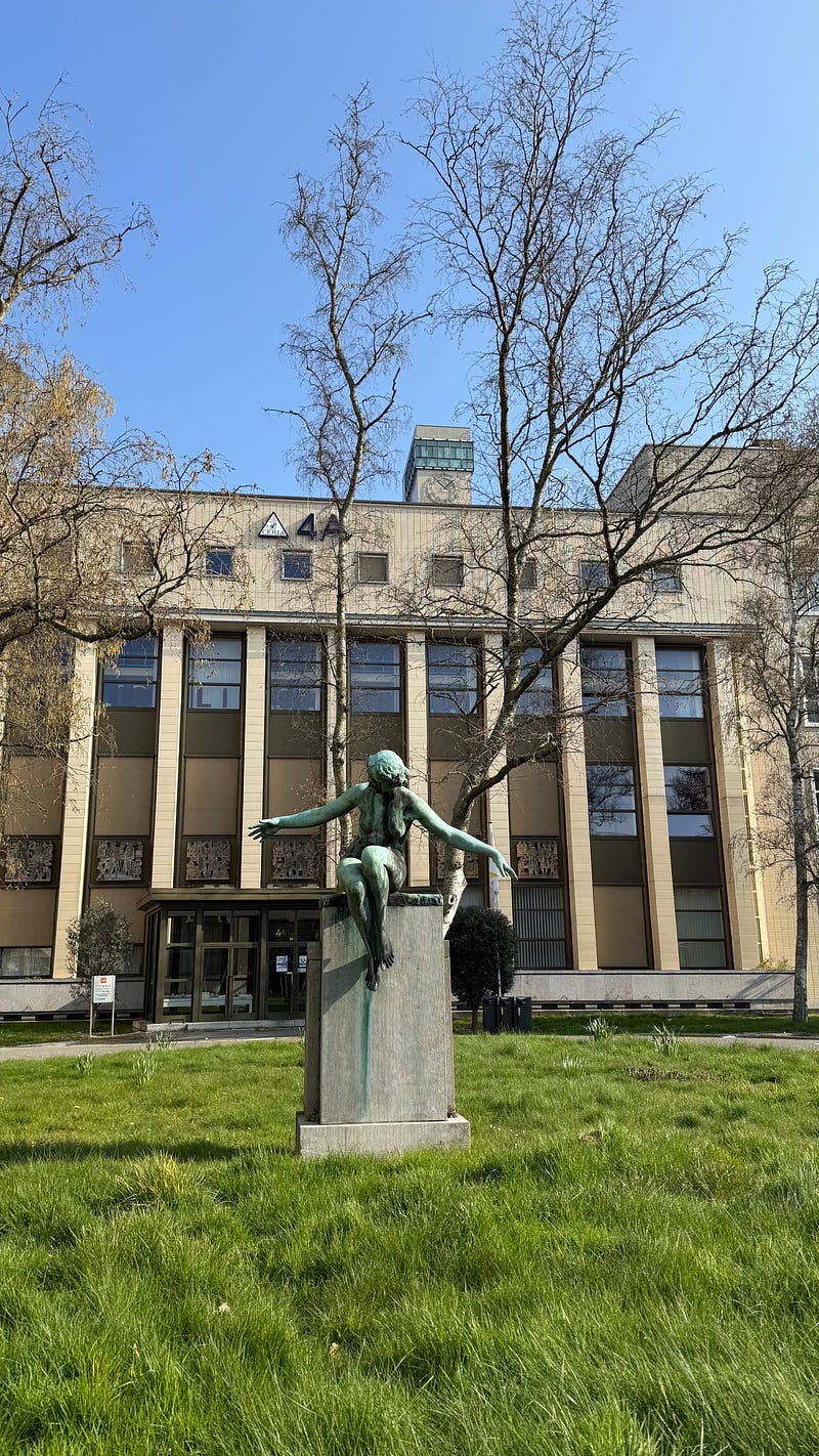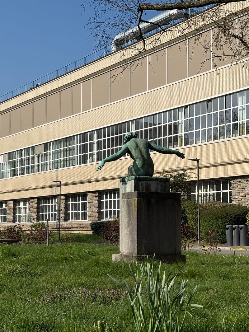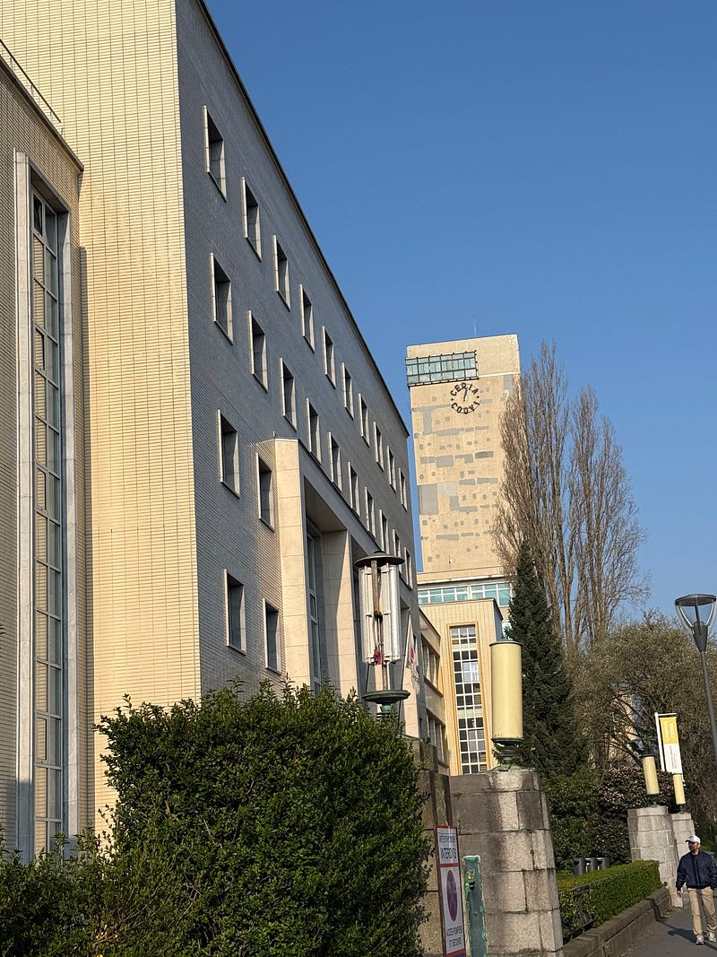 I’m writing this sitting in the sun, somewhere I didn’t expect to find myself on a Sunday in Brussels : the Ceria–Coovi campus, designed in the 1950s by Antoine Courtens. Pavilion-like buildings scattered across a green landscape, still largely intact, with that particular modernist generosity: wide circulation, plenty of light, functionality.