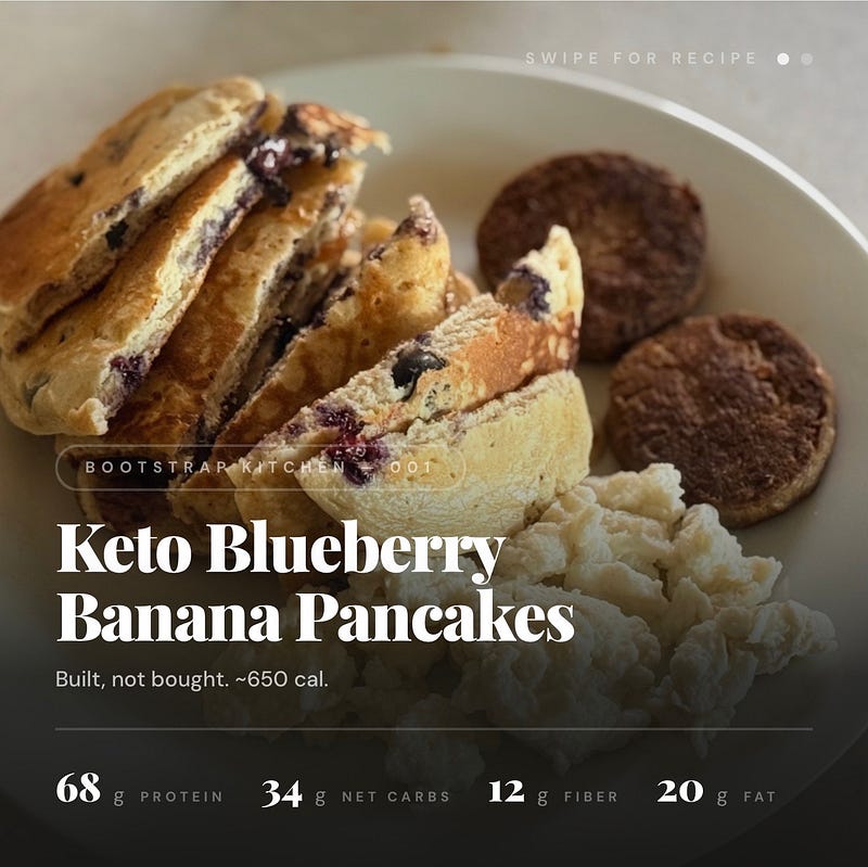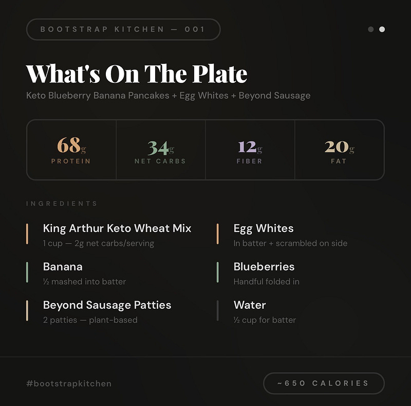 Saturday morning after a solid training week. No meal prep service. No $18 smoothie. Just a bag of King Arthur Keto Wheat mix, some egg whites, half a banana, a handful of blueberries, and two Beyond sausage patties.