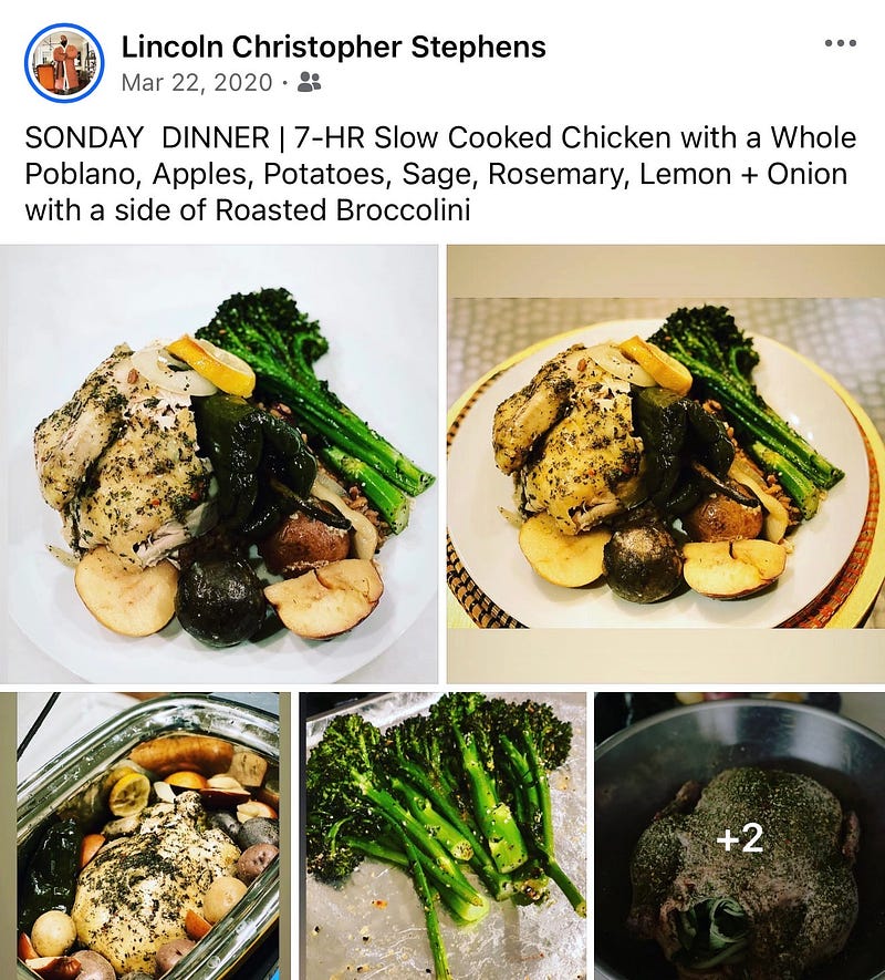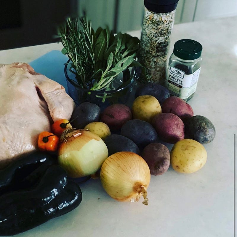 March 22, 2020. First Sunday of lockdown. World shut down, kitchen opened up. Whole chicken rubbed with sage, rosemary, and poultry seasoning, then slow cooked 7 hours with a whole poblano, rainbow potatoes, apples, lemon, onion, and a couple habaneros for good measure. Pulled it out fall-apart tender and plated it with charred broccolini. This was the meal that said: we’re going to be alright.
