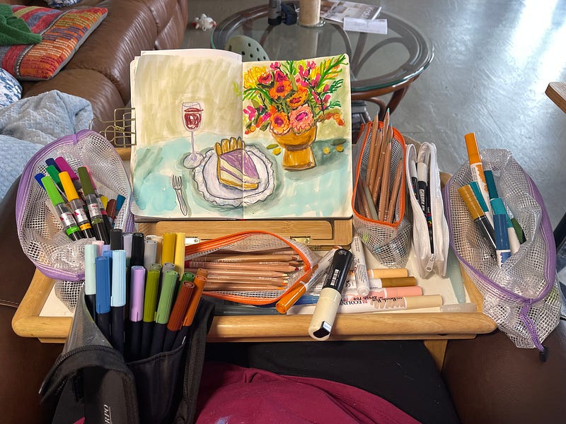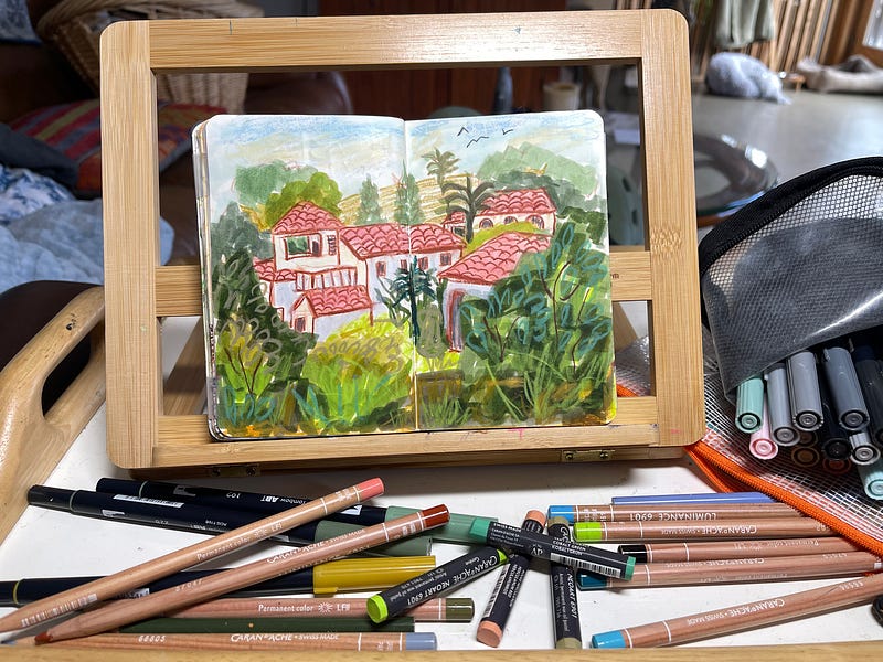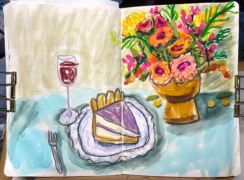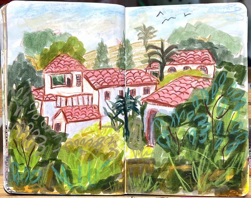 We had another snow storm today so I tucked myself into my Art Nest and did this mixed media sketchbook spread inspired by Nathalia Velásquez on Patreon today. I never would have picked the complex scene she chose to draw on my own, (and I might have even groaned a little when I saw her reference photo) 😉 But I have to say I thoroughly enjoyed this exercise! After watching her create her simplified version, which was so cool and way looser than mine, I felt encouraged to give it a go, and I’m so glad I did! I will post yesterday’s mixed media sketch here too. Simple joys despite the late snow and cold 🤗💜