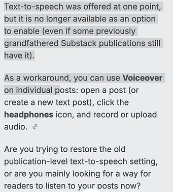 I am very disappointed that Substack decided to take away the text to voice feature from my two publications. I only just realised this happened. I knew I had the option on my publication because one of my paid readers is visibly impaired and used the text to voice option to read/listen to my texts, but they now have to use another app to help t…