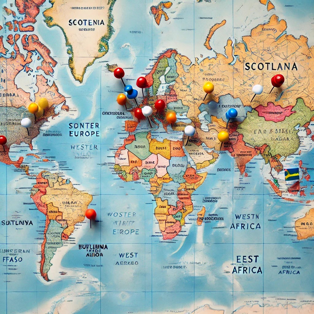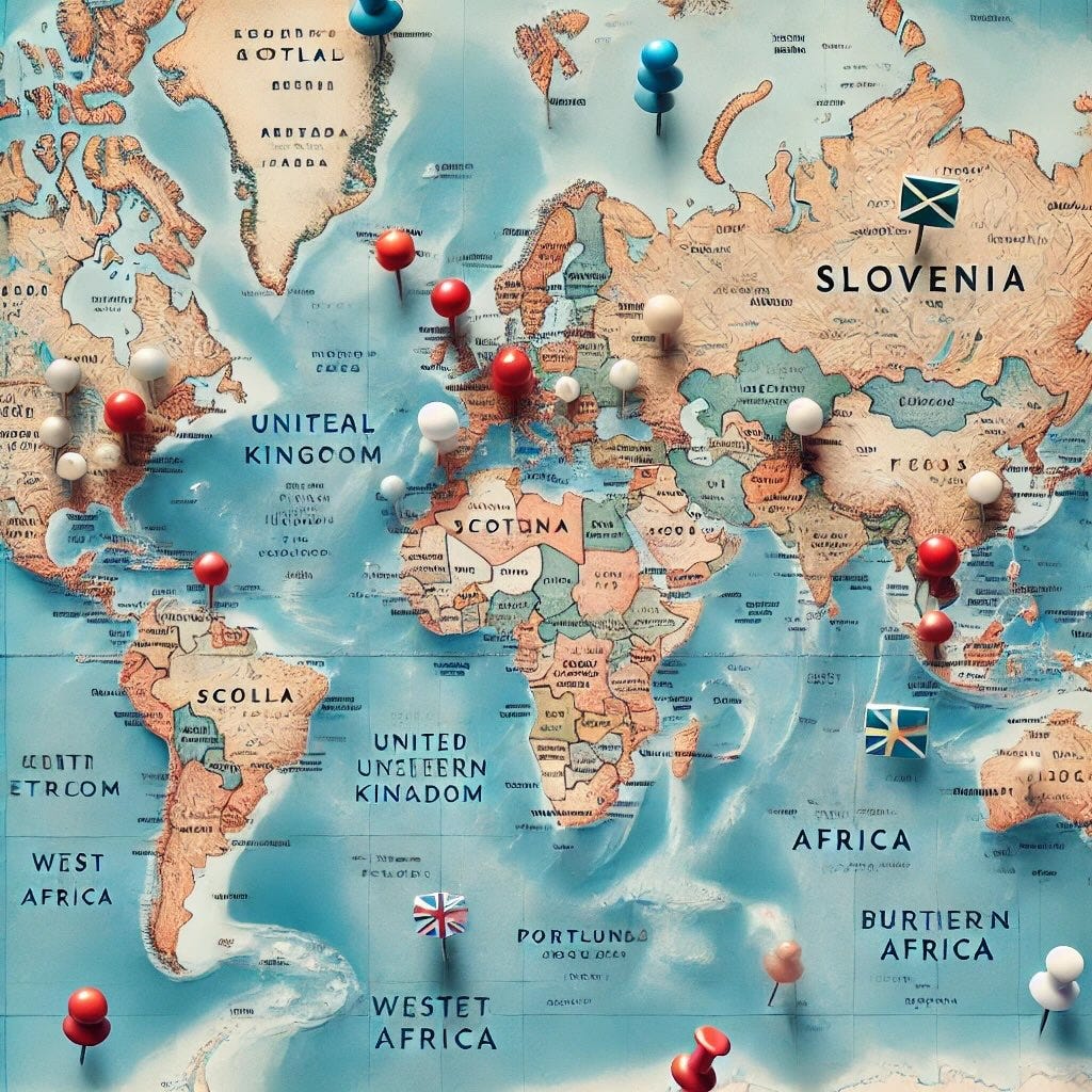 I have been thinking about posting an image with the map of the world and pins in all the countries I have lived in so far. And since I don’t know how to use CANVA, I thought I’d ask ChatGPT. Oh boy, if I ever needed proof not to trust AI, this is it. Here is what I asked: “Can you give me an image of the map of the world and pins in the following countries to indicate where I have lived: Slovenia, Scotland, Umbria and Tuscany in Italy (one pin is enough), Catalunya in Spain, Portugal, Sweden, Burkina Faso and Ethiopia” and here is what is produced (and yes, three images, because I asked it to correct the first two, but it seems this was too hard). So it just made up stuff.