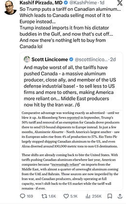 This is a big deal. I often write about aluminum, and predicted last year that the tariffs would have a major effect. “the price of an F-150 pickup truck just went up; there’s not enough American aluminum for all the cars and trucks that use it. Airbus just got a nice gift as Boeing is now paying more. And your next can of beer will be a bit more expensive because there is going to be even more competition for recycled aluminum. You all know who to thank.” And it just got a lot more expensive again! lloydalter.substack.com…