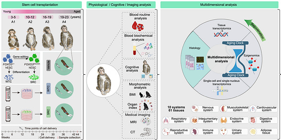 Researchers used FOXO3-enhanced mesenchymal stem cells intravenously for 44 weeks (biweekly) in monkeys.