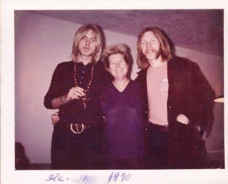Geraldine Allman with her boys Duane & Gregg in 1970. "You might say Duane was born to lead. Some people are. Gregg is a lover, and laid-back—he'd rather have a leader. One summer, they had a lemonade stand, Duane and Gregg and one little neighborhood boy. So when I got home, they were telling me about it. Gregg says he got to pour the lemonade. And the other little boy says he could hand it to the customer. So I said, 'Duane, what did you do?' And he says, 'Oh, I'm the advertising manager.'"