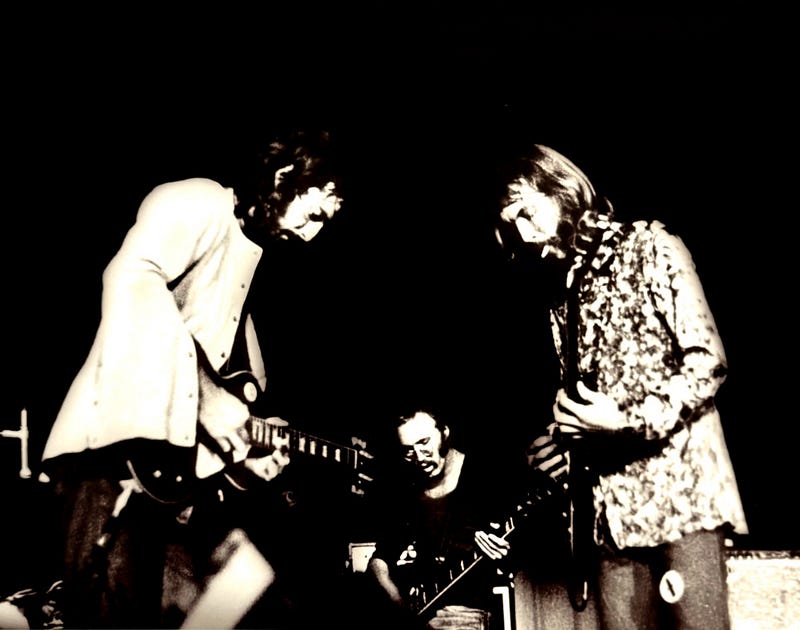 Sparks flew immediately when Duane Allman and Eric Clapton met for the first time. “They go through the rest of the show. The show is over, then we all meet backstage and we’re talking, and I said, ‘Well, we’re going back to the studio because we have to listen to a couple of more things we were working on today.’ Duane says, ‘Can I come by?’ By the time we got to the studio, it was probably 12:30. Along with Duane came the whole goddamn band! All of a sudden there’s Eric and Duane and they’re strapping on guitars and trading licks and showing each other, ‘No, no—put it on this string—do it this way—this is how…’ And they’re swapping stories with each other while they’re playing. I said, ‘Hey, keep tape on the machine. Just keep it rolling.’ Into the morning and on into the early afternoon, they were still chopping along with each other. They had a good time, and they were talking and swapping instruments and doing all kinds of things. Two kindred spirits met.” Tom Dowd on Duane Allman and Eric Clapton
