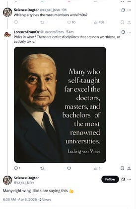 Modern universities have added moral credentialism to cognitive credentialism. A typical product responds to intellectual challenge with personal abuse followed by blocking response.