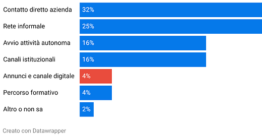 In Italia, solo il 4% degli occupati ha trovato lavoro tramite un annuncio. Il canale più efficace? Le relazioni. Il 25% ha ottenuto il posto attuale grazie alla propria rete di conoscenze, il 32% attraverso un contatto diretto con l'azienda.