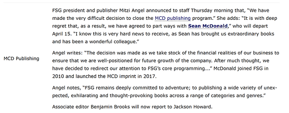 Whoa. Just as the Ben Lerner wave peaks, FSG shutters MCD.