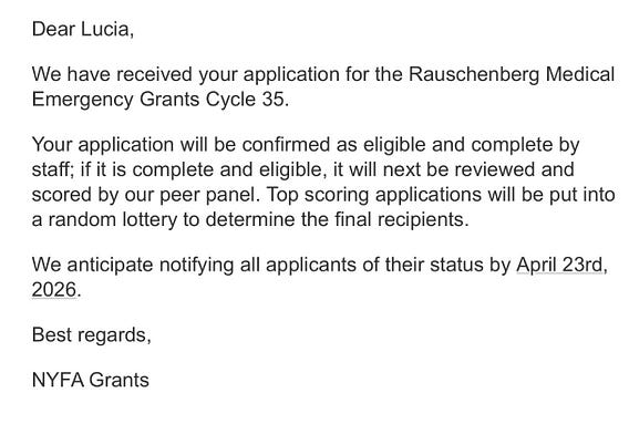 Being an artist is crazy. Like, I’m praying that my CV is strong enough to put me in the “top score” so I can ENTER A RAFFLE to pay my medical bills rn? And they will let me know in April?