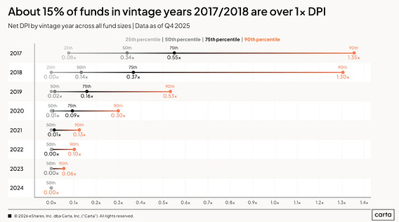 The 2017 and 2018 vintages are the most mature, with most funds in each cohort claiming at least some amount of DPI and the top 15% or so registering DPIs above 1x.