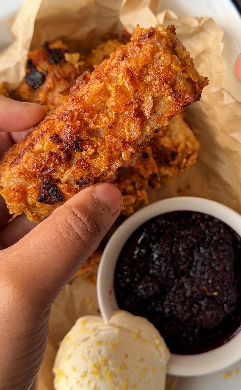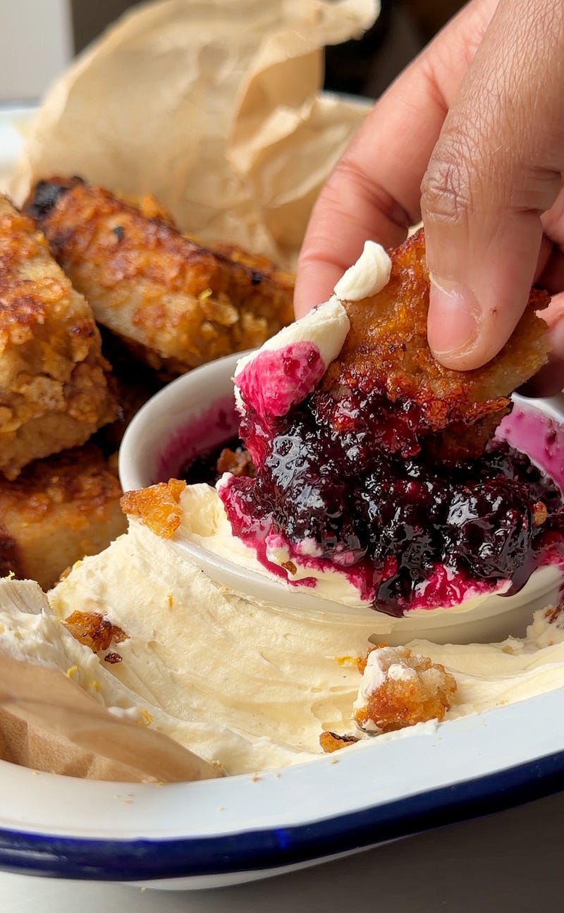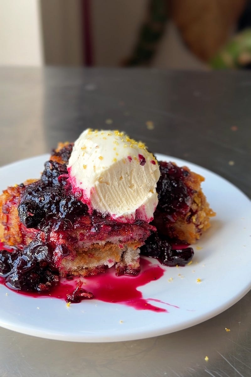 Cereal Milk Cookie Butter French Toast 🥣🥛. A brunch special, this is what happens when you combine frosted flakes, stale bread, cookie butter, brown sugar batter, blueberry compote & citrusy whipped cream.