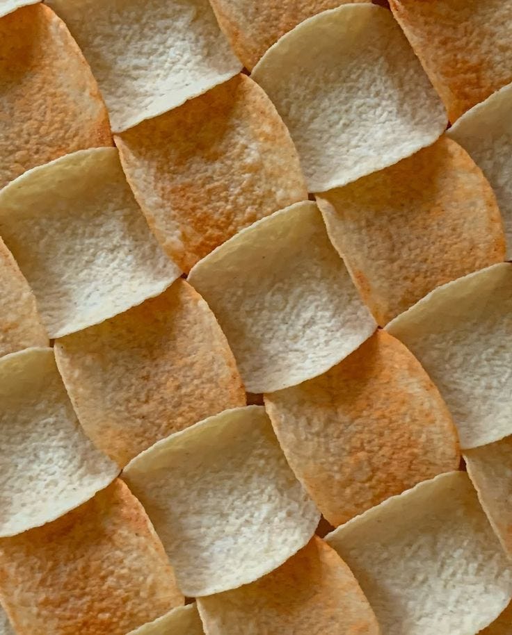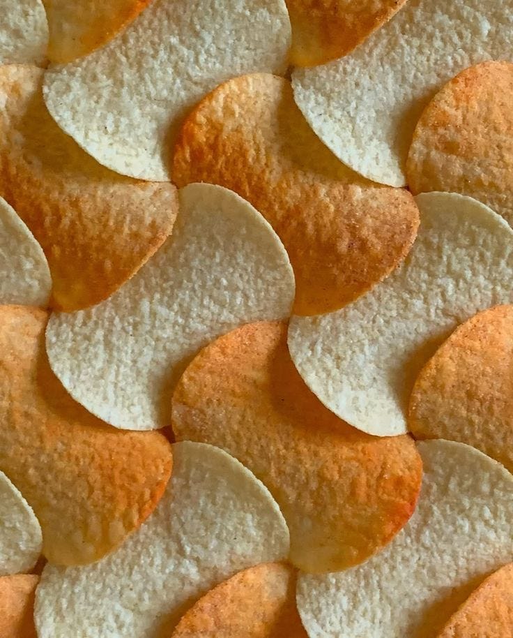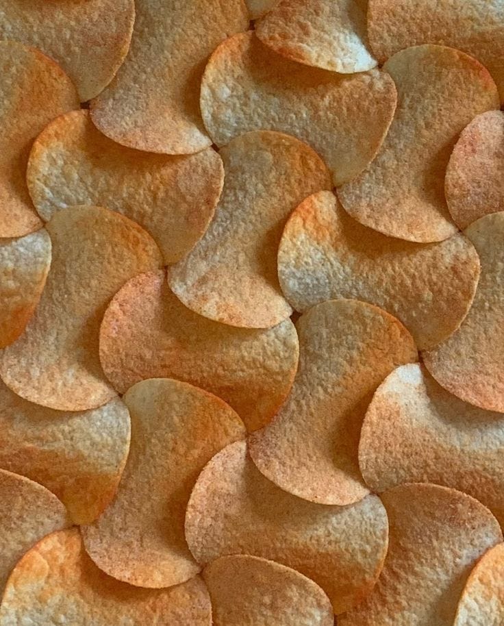 Patterns created with Pringles potato chips (original & paprika) by textile artist, Theo Rooden.